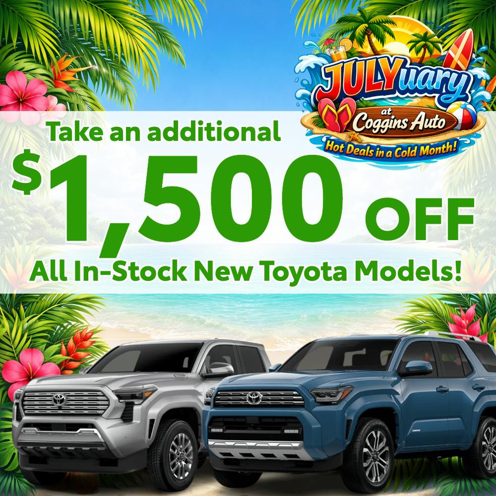 Offer valid on NEW 2025/2026 Toyota models that are in-stock. Additional $1,500 off our advertised price. Limitations may apply. See Coggins Toyota for complete details.