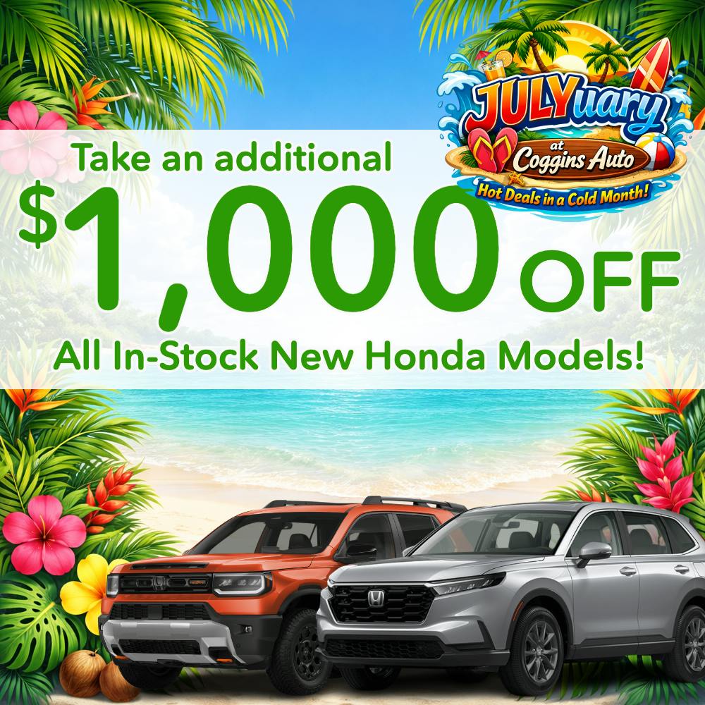 Offer valid on NEW 2025/2026 Honda models that are in-stock. Additional $1,000 off our advertised price. Limitations may apply. See Coggins Honda for complete details.